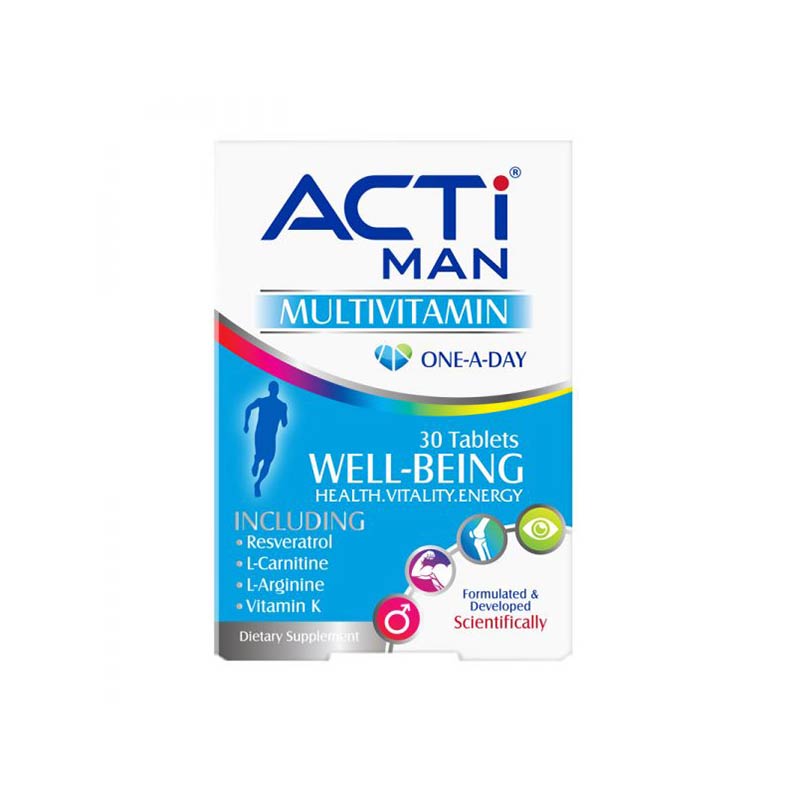 اکتی من یک مولتی ویتامین-مینرال شامل ۳۱ ماده موثره جهت استفاده روزانه آقایان می باشد. این مکمل دارای تمامی ویتامین های محلول در چربی (K, A, D, E) و محلول در آب (B, C)، زینک، آهن، اسید آمینه های ال-آرژنین و ال-کارنیتین، عصاره جینسینگ، کوآنزیم کیوتن، اسید فولیک، رزوراترول، تائورین، پارا آمینو بنزوئیک اسید و مواد معدنی دیگر است که به طور تخصصی برای تامین ویتامین ها و املاح معدنی بدن آقایان به کار می رود.