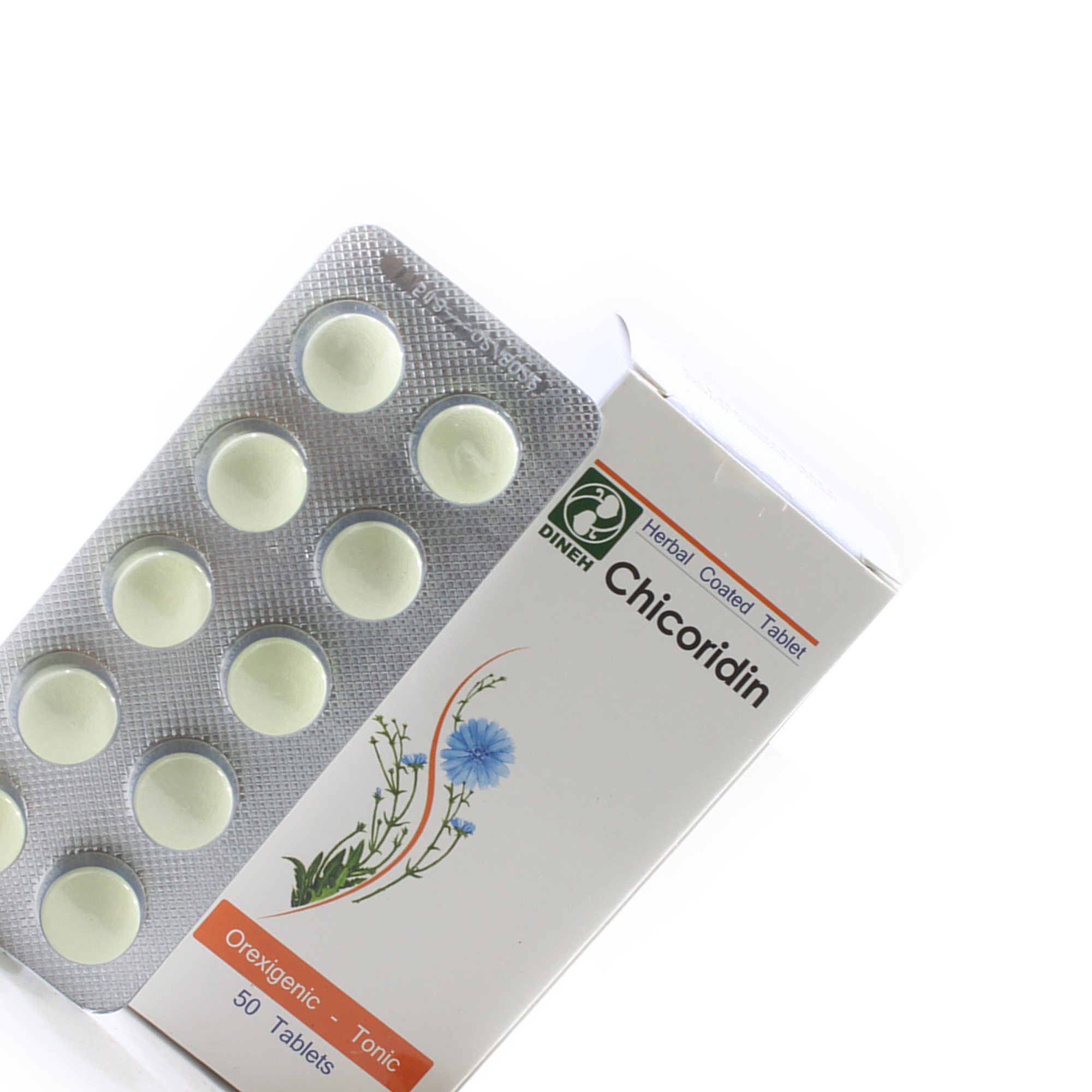 قرص شیکوریدین فرآورده ای گیاهی است که از عصاره ریشه کاسنی (Cichorium intybus) ، دانه شنبلیله (Trigonella foenum-graecum) و اسانس رازیانه (Foeniculum vulgare) تهیه شده و به میزان 4 میلی گرم پلی فنل تام بر مبنای پیروگالل در هر قرص استاندارد شده است . ریشه کاسنی حاوی مقدار کافی مواد قندی، اینولین، لاکتوسین ، لاکتوپیکرین و املاح معدنی (کلسیم ، پتاسیم ، فسفر،سدیم ، منیزیم ، منگنز و مس) ویتامین های گروه B ، ویتامین C ، ویتامین K و دانه شنبلیله دارای قندهایی مانند استاکیوز، گالاکتومانها، ساپونین ها مانند دیوسژنین، لیپیدها، پروتیدها و نوکلئوپروتیدها، ترکیبات فسفره مانند لسیتین ، فیتین و ترکیبات ازته مانند کولین و تری گونلین می باشد که ماده اخیر می تواند مولد ویتامین pp (نیکوتین آمید) باشد. اسانس رازیانه دارای حداقل 60 درصد آنتول و همچنین انیس آلدئید، دی پانتن، فنکون، فلاندرن و پینن می باشد.