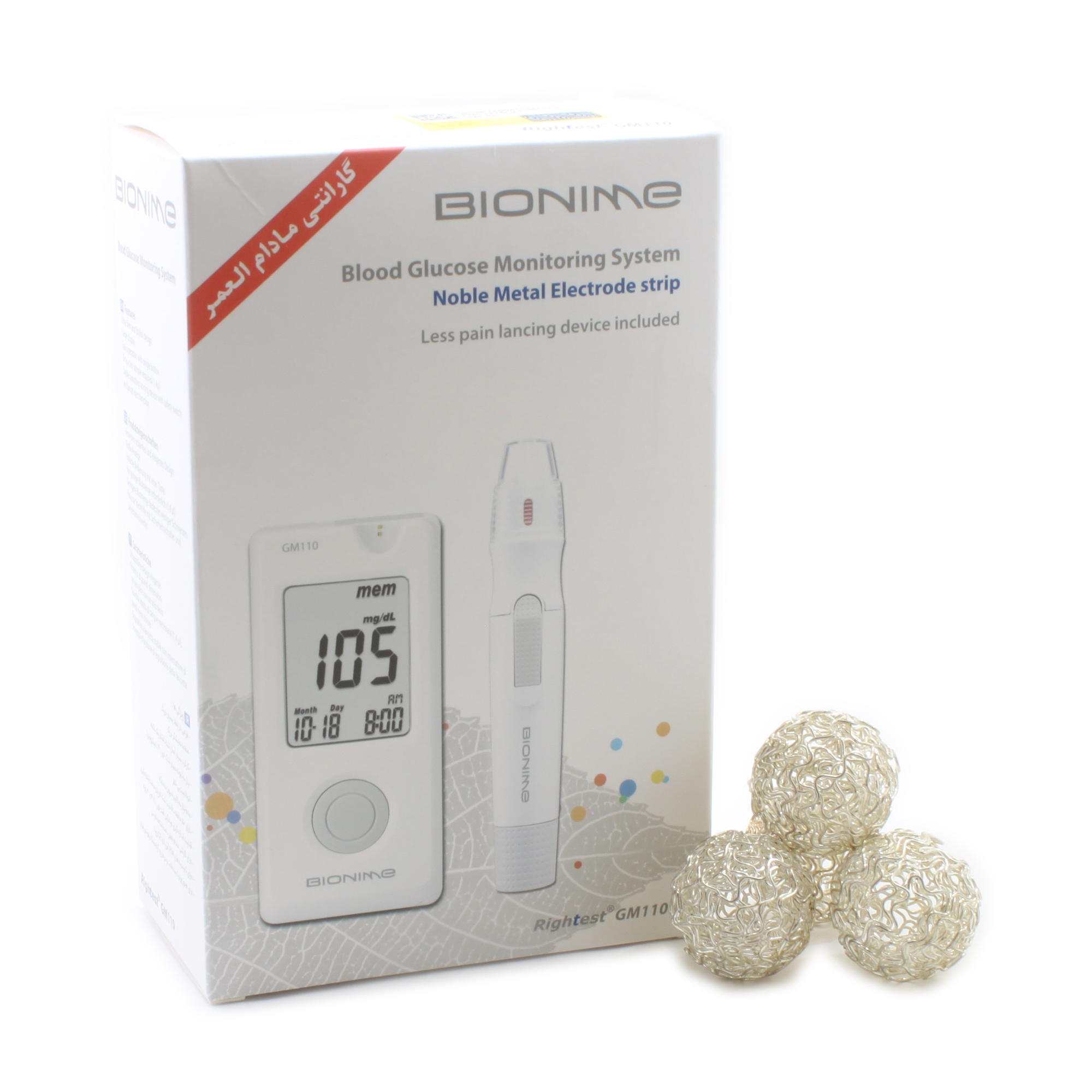 اقلام همراه دستگاه شامل قلم سوزنزنی، 10 عدد سوزن و دفترچه راهنمای فارسی است. همهی این اقلام داخل یک کیف نگهداری کوچک و محکم ارائه میشود. به طور خلاصه تست قند خون بایونیم Rightest GM110 دارای 150 حافظهی ذخیرهسازی، قابلیت میانگینگیری از نتایج، صفحهنمایش LCD، نمایش نتیجه در 8 ثانیه، قابلیت خاموشی خودکار و یک کیف نگهداری است. در آخر باید گفت که Rightest GM110 برای اندازهگیری دقیق قند خون، فقط به 1.4 میکرولیتر خون نیاز دارد.
