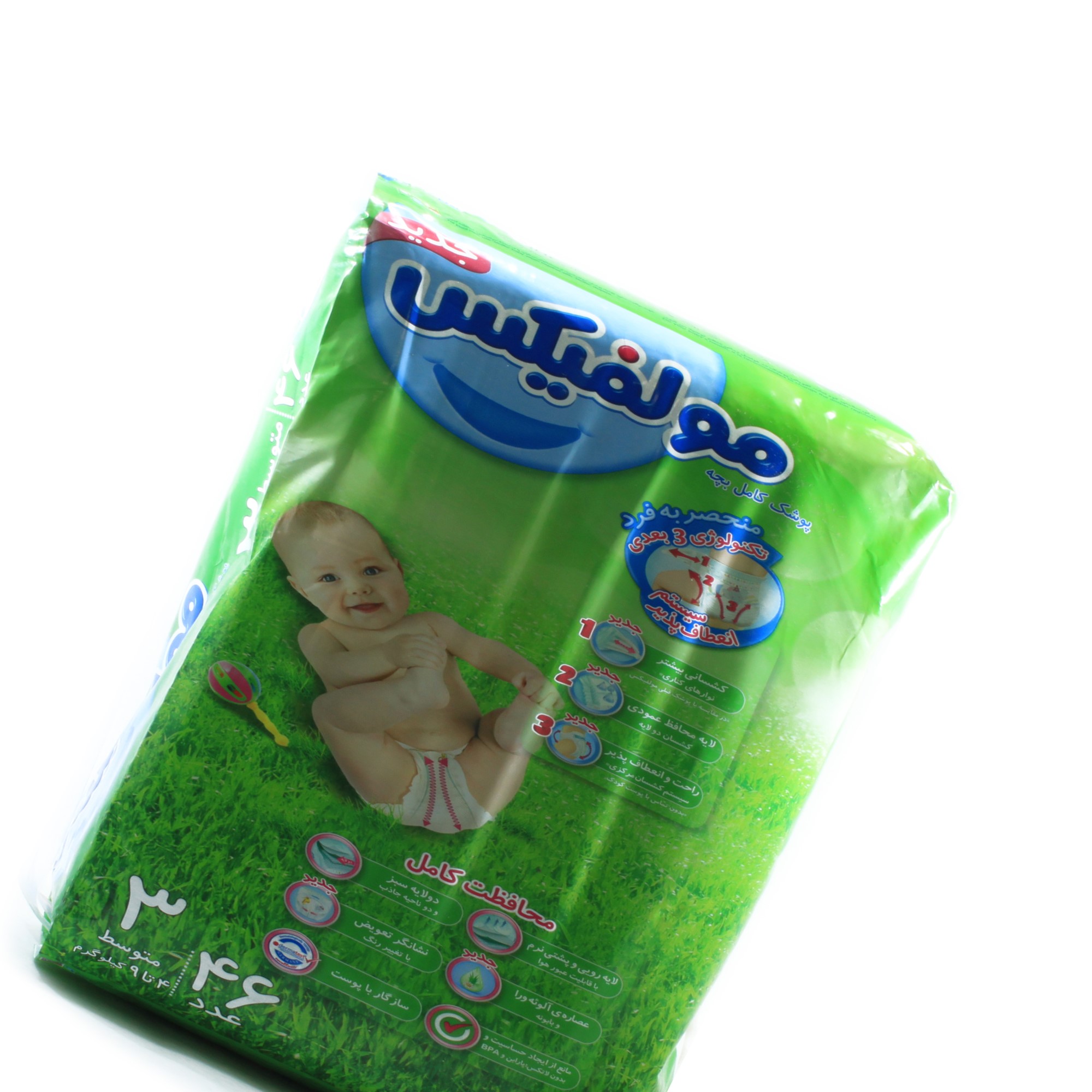 دارای چسبهای محکم و ضد حساسیت دارای لایه عبور هوا دارای انحنای مخصوص بند ناف دارای نوار پهلو با خاصیت کشسانی برای حرکت آزادانه دارای لایه های عمودی جهت جلوگیری از نشت